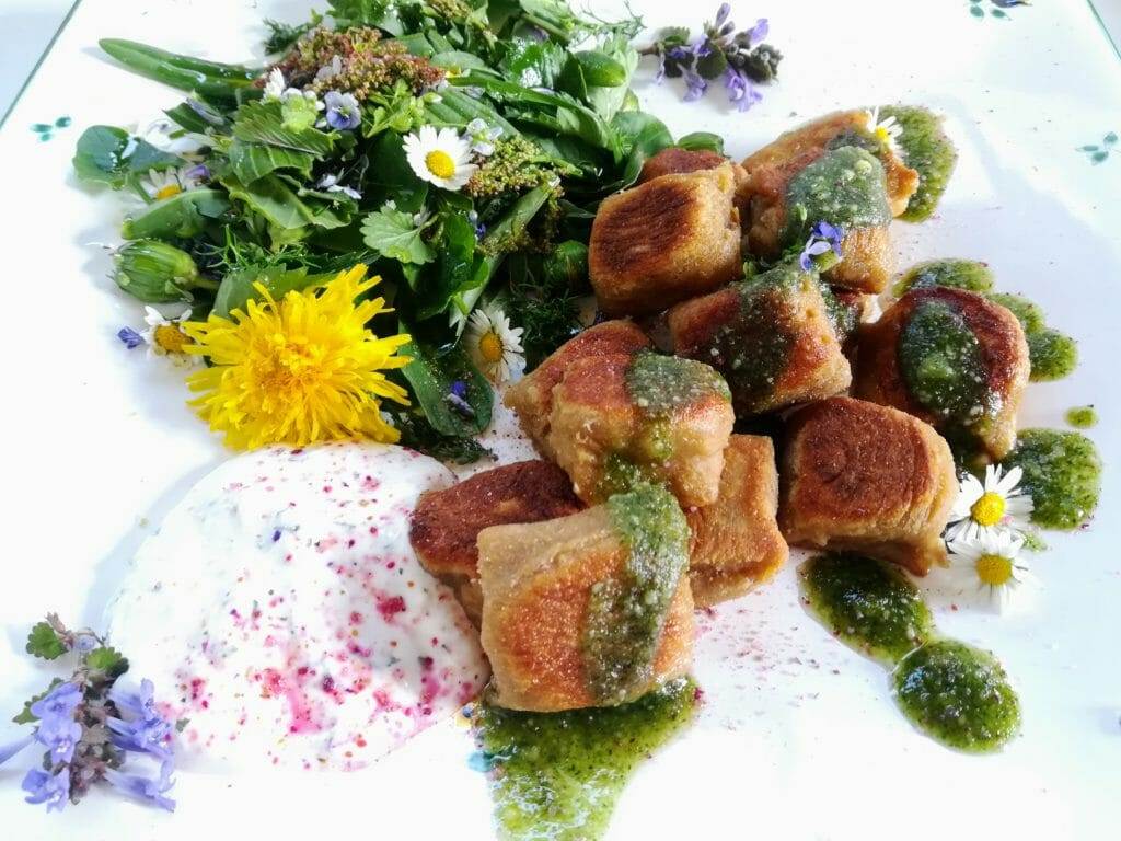 Niedei mit Wildkräuterpesto auf Wildkräutersalat © AlmSinn