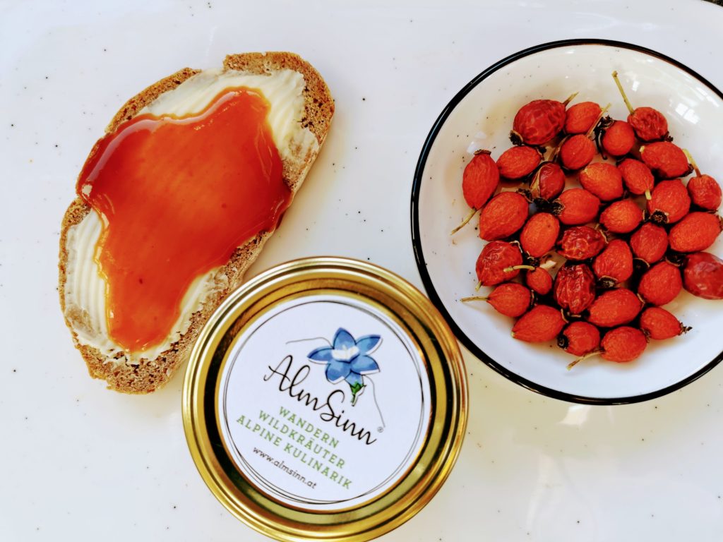 Der samtig, süßsaure Geschmack mit dem leichtem Rosenaroma macht das Hagebuttenmus zu etwas ganz Besonderem in deinem Repertoire an selbst gemachten Köstlichkeiten.